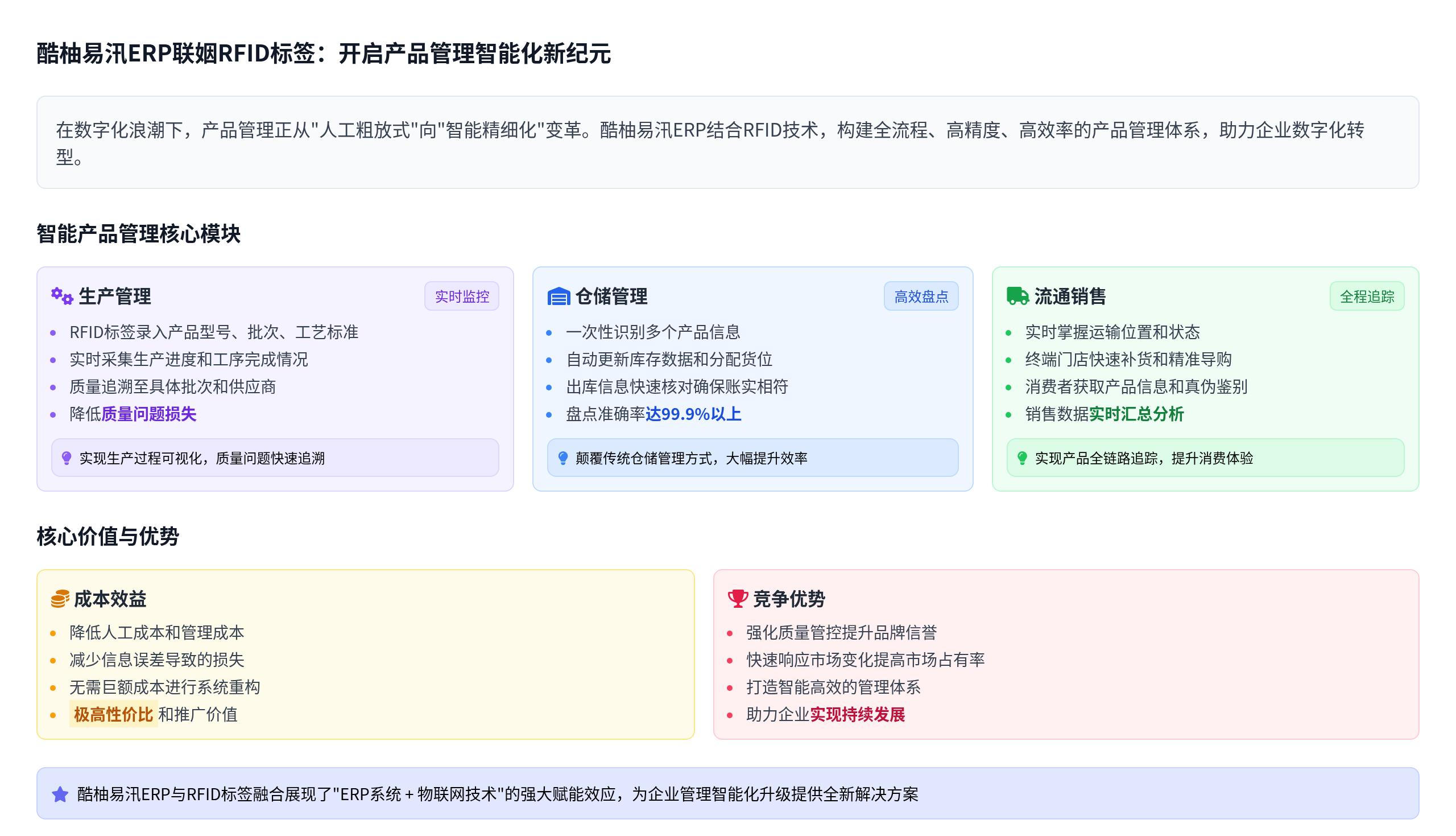 酷柚易汛ERP接入RFID标签技术,不仅优化了产品管理的各个环节,更从根本上提升了企业的核心竞争力。通过实现产品信息的自动采集与实时共享,企业降低了人工成本和管理成本,减少了因信息误差导致的损失;通过全流程的追溯管理,企业强化了质量管控,提升了品牌信誉;通过精准的数据分析与决策支撑,企业能够快速响应市场变化,提高市场占有率。对于中小企业而言,这种智能化的管理模式无需投入巨额成本进行系统重构,只需在现有酷柚易汛ERP基础上接入RFID设备即可实现,具有极高的性价比和推广价值。