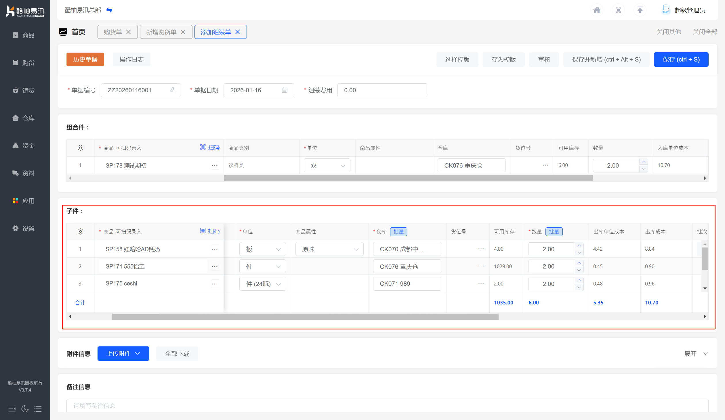 2️⃣组装单数据保存生效后,系统会按子件商品的成本和组装费用自动计算组装商品出库成本。