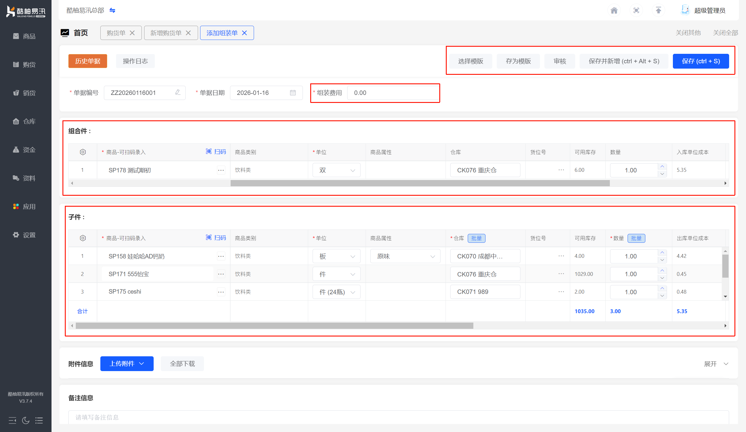 1️⃣点击【仓库】-【组装单】,录入组装商品及子件商品基本信息,点击【保存】;