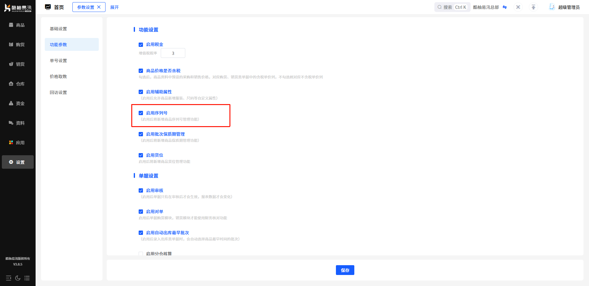 使用管理员账号,点击 【设置】-【系统参数】-【功能参数】-【启用序列号】,点击【保存】参数。