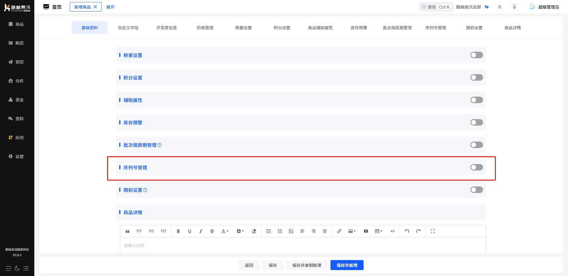 点击【商品】,点击左上角【新增】商品,开启【序列号管理】