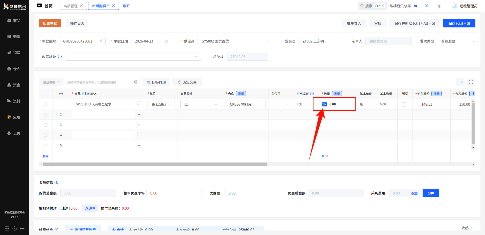 以采购入库单为例:点击左侧菜单栏【购货】-【购货单】-填写【序列号】信息。