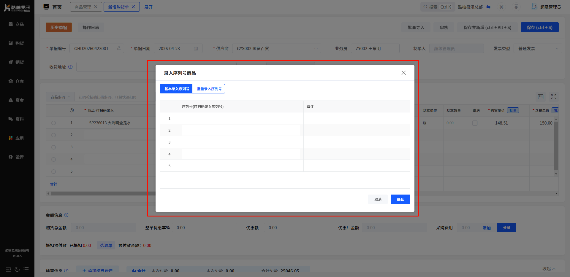 完成设置后,填写购货、销货单据时即可输入商品序列号信息。