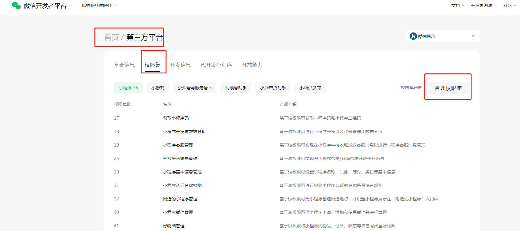 3、选择公众号和小程序的权限,建议都勾选上,避免业务端授权公众号和小程序时,出现缺少权限集的情况